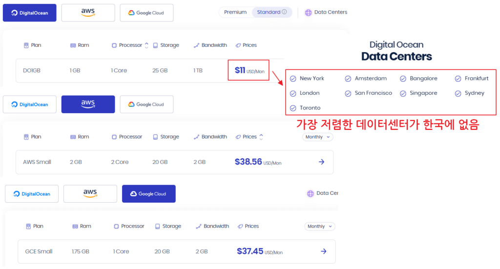 • 한국 데이터센터가 없음 (더 높은 가격대의 AWS, Google Cloud로 가야 서울센터 이용 가능)