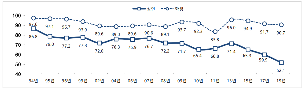 여기서 독서율은 지난 1년 동안 종이책을 1권 이상 읽은 인구의 비율을 뜻한다. 성인의 표본은 학생보다 많은 6,000명인데, 눈에 띄는 것은 역시나 성인들의 급격한 독서율 하락으로, 불과 6년여 만에 독서율이 20%나 감소한 것을 확인할 수 있다. 종이책만 놓고 봐서 그런 것 아니냐고? 물론 합친 지표를 봐도 그 의미는 크게 달라지지 않는다.