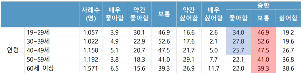 71.3% (4,278명) 에 달했던 독서율이 무색하게 젊은 인구가 독서를 좋아한다고 응답 (매우 좋아함 + 약간 좋아함) 한 평균 비율은 29% (1,740명, 푸른색 영역) 에 지나지 않았다.