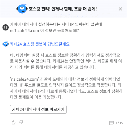 가비아의 경우 서버 IP 입력란이 없는데, 서버 URL만 잘 입력됐다면, IP주소로 자동으로 적용된다고 카페24 AI챗봇이 답변해 주었다. 앞의 과정에서도 다양한 질문을 많이 했는데 답변이 꽤 유용했다.