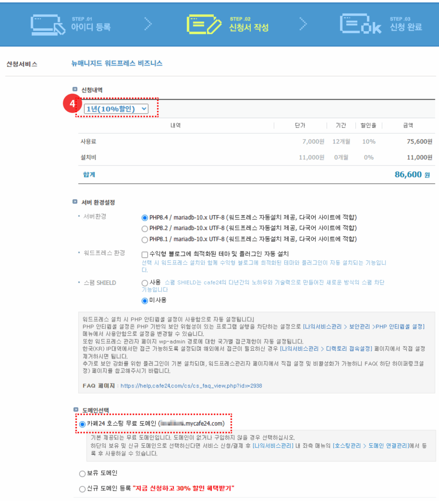 ④ 이용 기간 / 카페24 호스팅 무료 도메인 선택