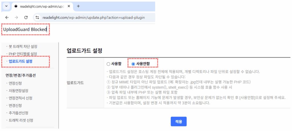 - 업로드 시 아래와 같은 경고가 뜬다면 카페24 호스팅관리 > 보안관리 > 업로드가드 설정에서 업로드 가드를 사용안함으로 변경해줘야 한다.