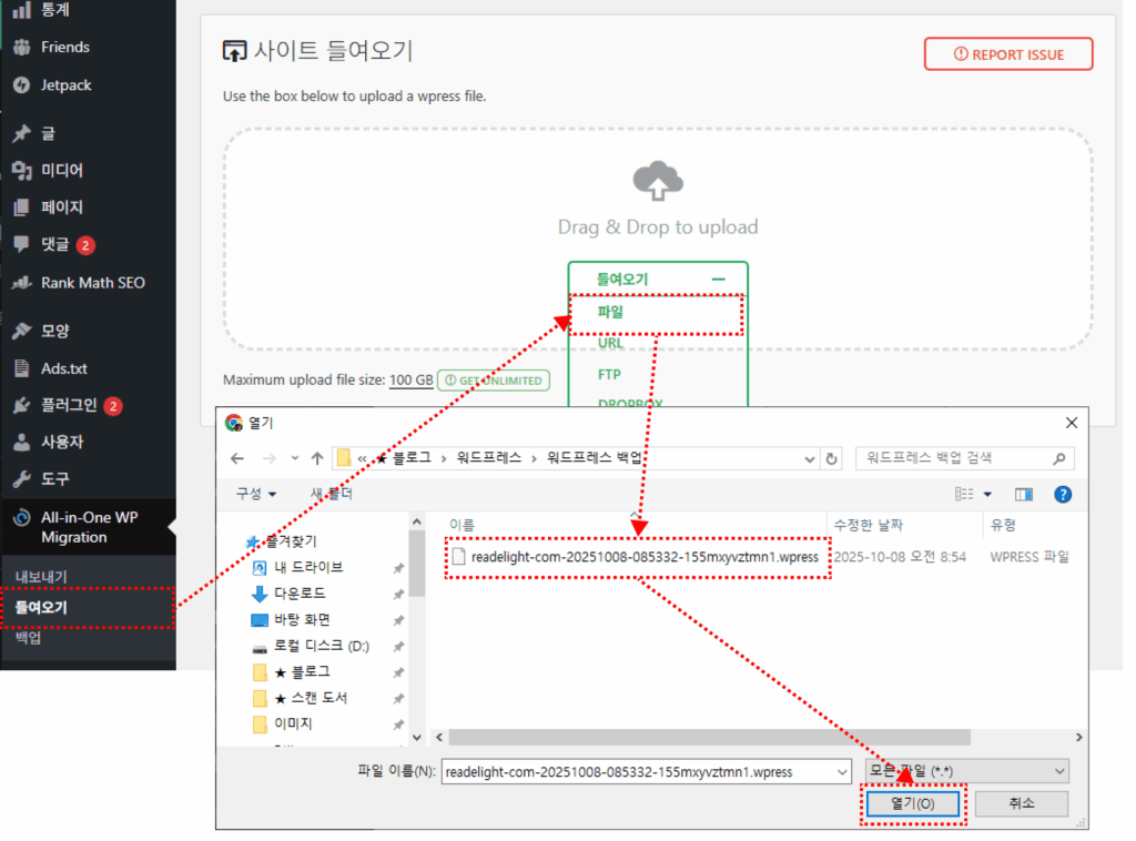 백업한 데이터 복원도 WP Migration 플러그인을 이용하면 된다. 다만 무료 버전은 업로드 용량에 제한이 있어 용량 제한이 100GB인 플러그인을 직접 다운로드 받아 설치해야 한다.