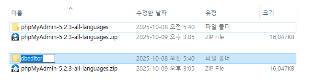 ③ PHPmyadmin 파일 압축 풀고 폴더명을 임의의 이름으로 변경 (예. dbeditor)
