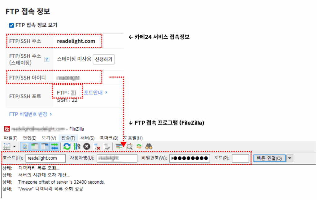 - 로그인 정보 확인 방법 : 카페24 호스팅관리 > 서비스접속관리 > 서비스 접속정보