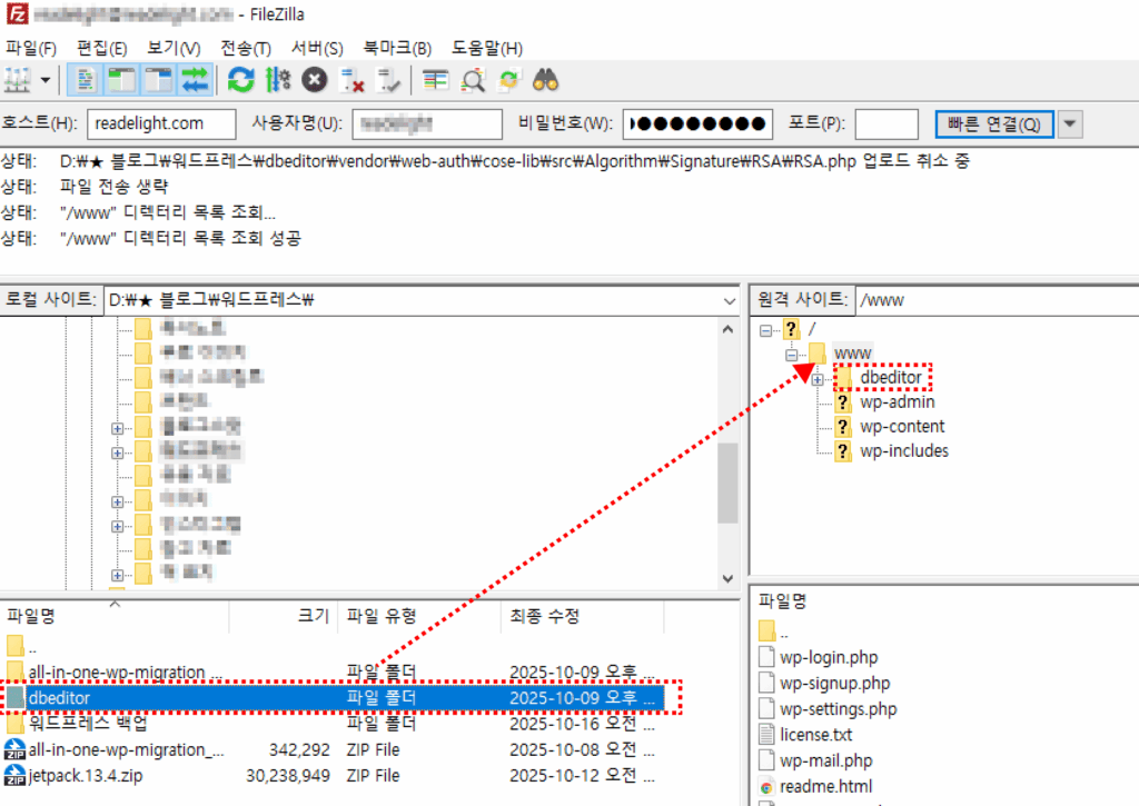 ⑤ dbeditor 폴더 드래그해서 www 폴더에 업로드