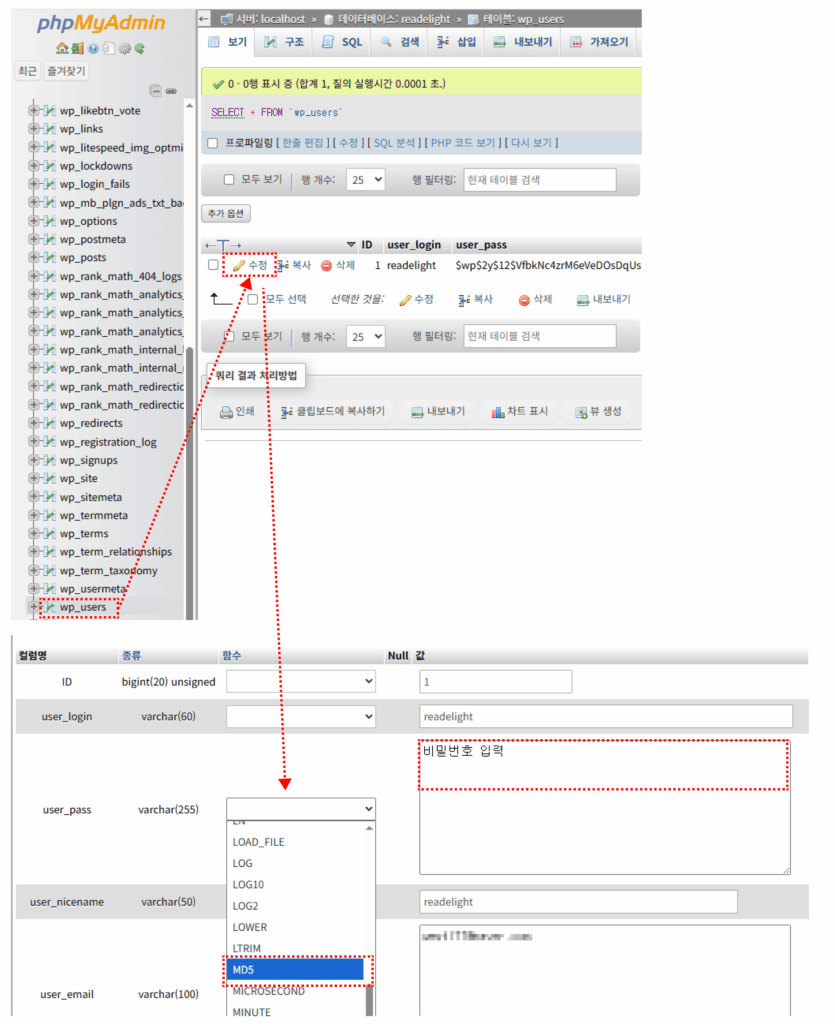 ⑦ wp_users 테이블 > 수정 버튼 클릭