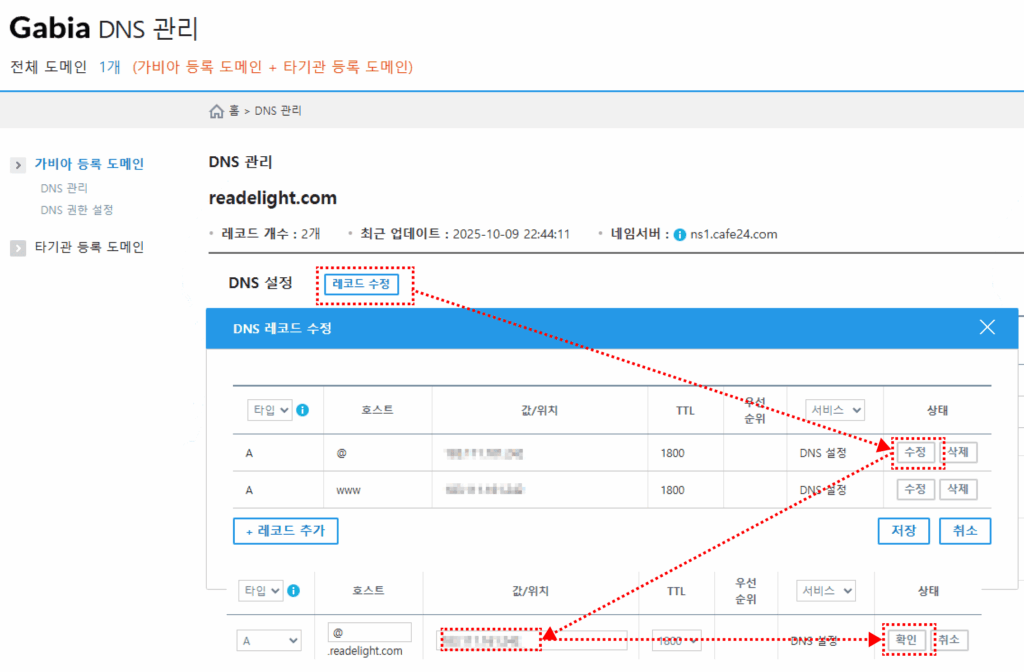 필자의 경우 가비아에서 도메인을 등록해 해당 화면을 예시로 캡쳐해 보았다. 레코드 수정을 통해 @, www 영역 모두 카페24의 서버 IP로 변경해 준다.