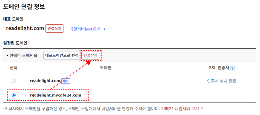 이제 마지막으로 카페24 자체에서 적용된 대표 도메인만 변경해 주면 이전 작업이 모두 끝나게 된다. 내 도메인을 대표 도메인으로 설정한 후, 카페24 자체 도메인은 삭제해 주자.