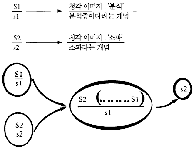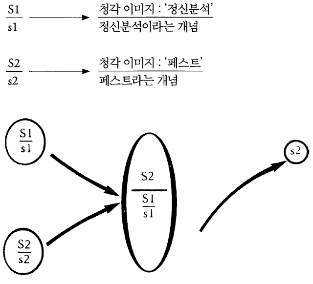 위 공식은 은유를 나타내는 것으로 여기서 (+)는 분리선을 넘었음을 의미하는 것으로 새로운 의미가 출현하기 위한 기호의 가치라 볼 수 있다.