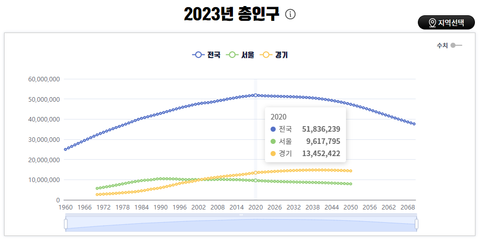 현재 우리나라 인구는 지난 2020년에 정점을 찍고 자연감소 (사망자 > 출생자) 중이다.