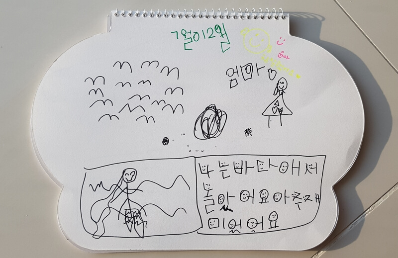 아이는 한글을 읽기 전까지는 그림만 보면서 자기 마음대로 읽더니, 어느 때부턴가 글자에 관심을 갖고 쉬운 것부터 조금씩 따라 읽기 시작했다. 막히는 게 있을 때는 물어보기도 하면서 더듬 더듬 읽었고, 희한한 형태로 따라 그리기도 하면서 점차 자신의 생각을 표현하는 도구로 활용해 나갔다. 어느덧 유치원에서의 마지막 학기를 보내고 있는 요즘은, 웬만한 글들은 자연스럽게 읽을 수 있는 정도가 되었고, 주기적으로 보는 받아쓰기 시험도 무난하게 치르고 있어 고맙고 대견한 마음이 든다.